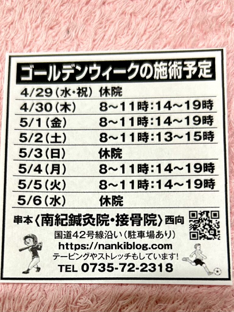 【令和8年4月の施術予定】 2026.4.20 南紀鍼灸院・接骨院 串本 和歌山
